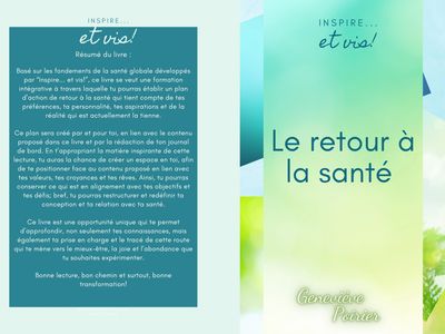 "Inspire... et vis!" est heureux de te présenter cette opportunité de formation intégrative par le biais d'un livre allié à un journal de bord. En effet, en creusant l'essence et les composantes des piliers qui forment la santé globale, nous avons créé un ouvrage contenant des connaissances, des réflexions, des pistes de travail personnel et des outils pour favoriser la prise de responsabilité de ton état de santé global.